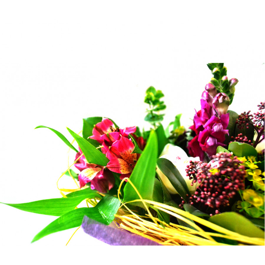 Необычное сочетание крупных свежесрезанных роз, грациозных орхидей, альстромелий и полевых цветов в окружении листов питтоспорума и рускуса в одно мгновение перенесут получательницу в восхитительный зеленый сад, полный благоухающих цветов и зелени. Удивите возлюбленную необычным подарком, который еще долго будет радовать ее яркими цветами и благоуханием.