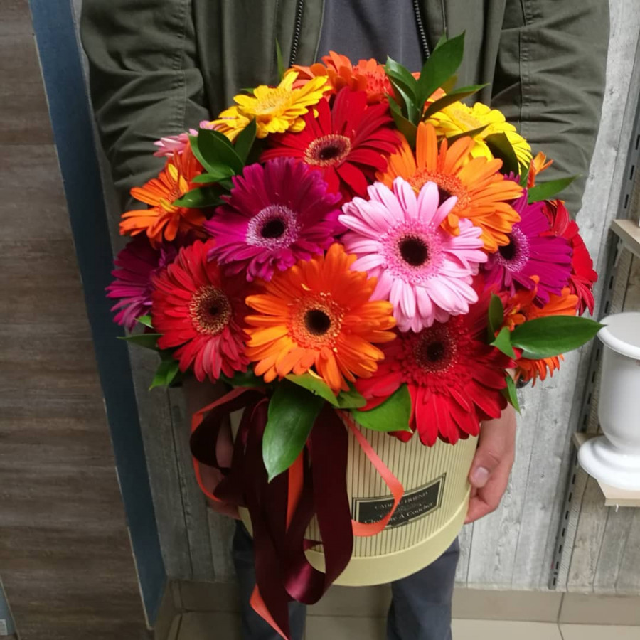 На фото композиция из 21 разноцветой герберы коробке. В составе: гербера 21 шт, коробка (m) 1 шт, . Все цветы свежие и ароматные, букет красиво оформлен и отлично подходит для подарка. Доступна доставка цветов или самовывоз.