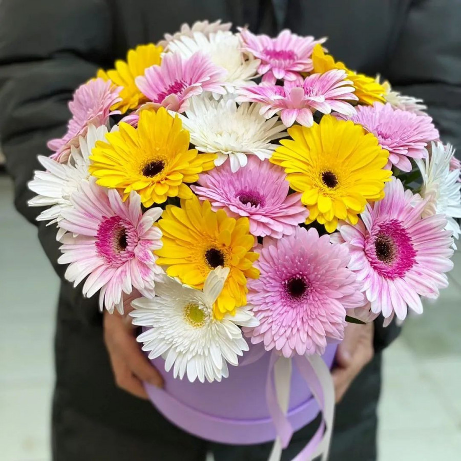 На фото композиция из 31 разноцветной герберы в коробке. В составе: гербера 31 шт, шляпная коробка (m) 1 шт, . Все цветы свежие и ароматные, букет красиво оформлен и отлично подходит для подарка. Доступна доставка цветов или самовывоз.