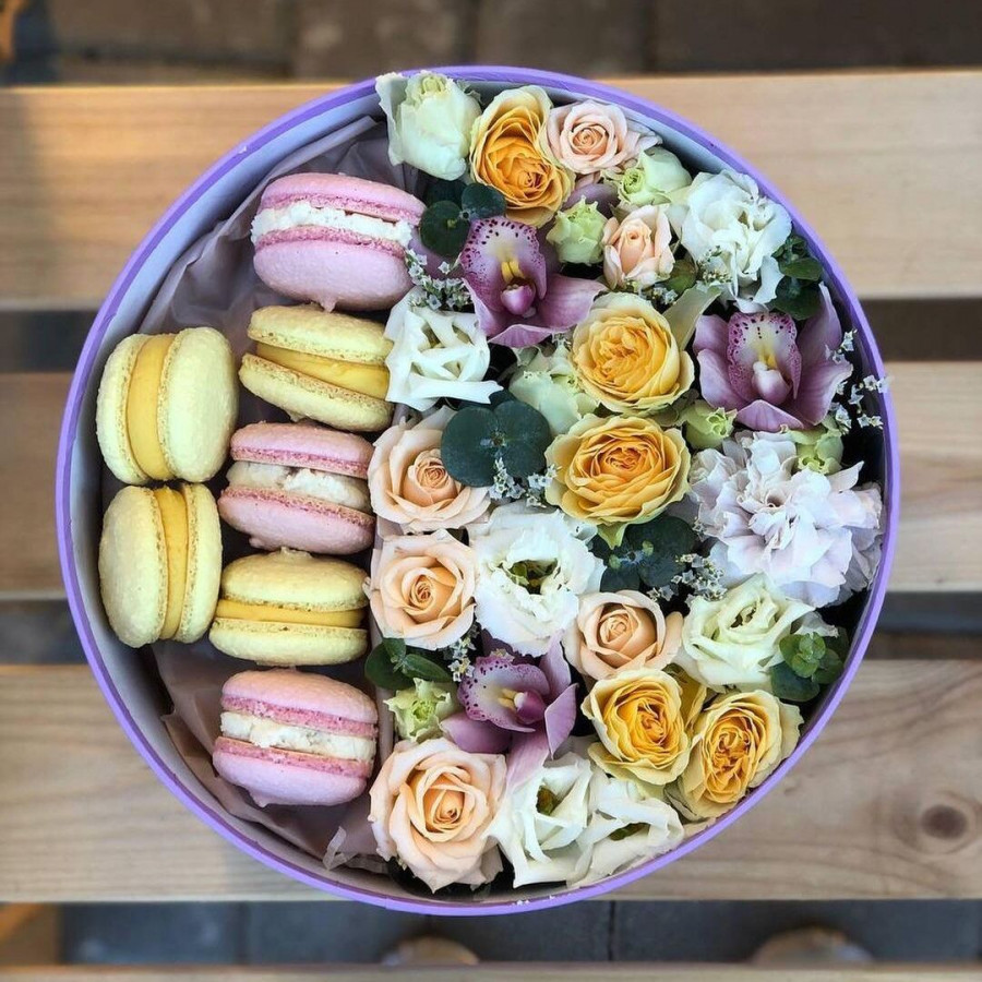 На фото композиция из 7 макарун и орхидеи. В составе: макаруны 7 шт, орхидея 3 шт, роза 9 шт, эустома (лизиантус) 3 шт, гвоздика 2 шт, коробка (m) 1 шт, . Все цветы свежие и ароматные, букет красиво оформлен и отлично подходит для подарка. Доступна доставка цветов или самовывоз.