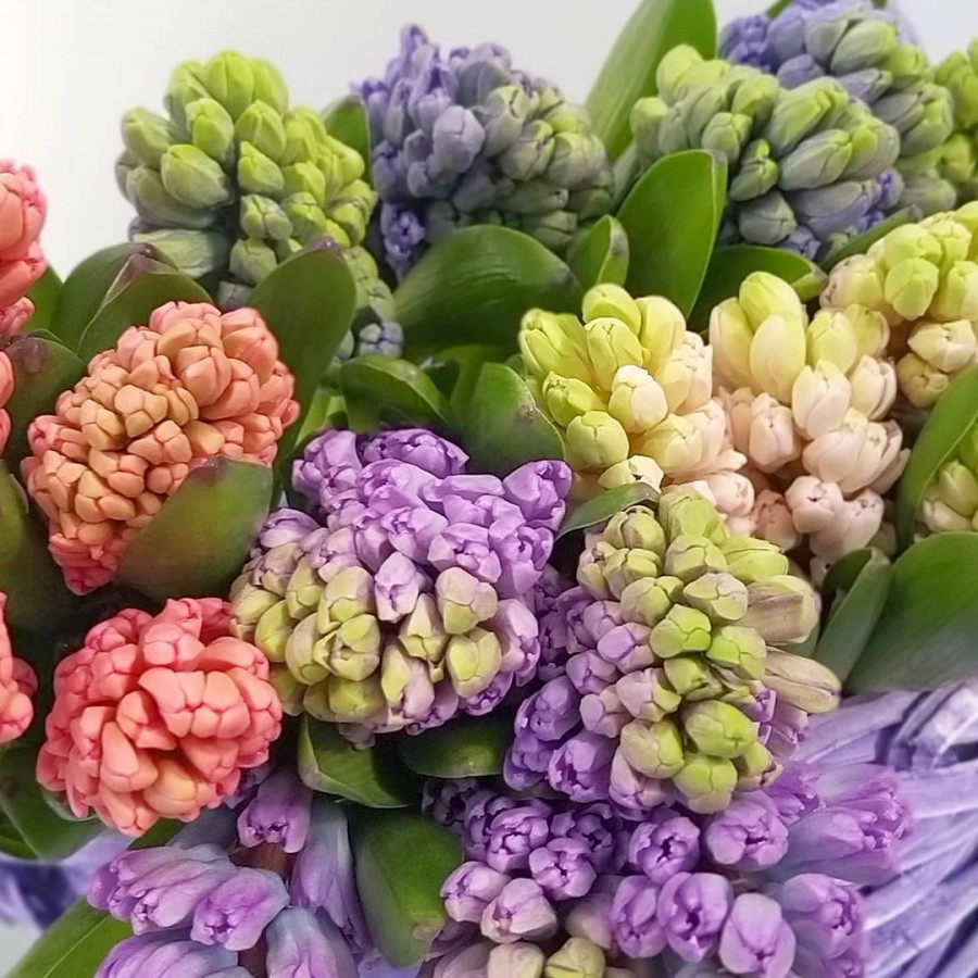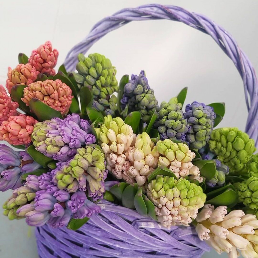 На фото композиция из гиацинтов в корзине. В составе: гиацинт 31 шт, корзина (m) 1 шт, атласная лента 1 шт, . Все цветы свежие и ароматные, букет красиво оформлен и отлично подходит для подарка. Доступна доставка цветов или самовывоз.