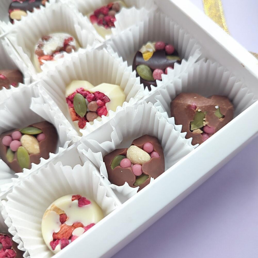 Состав : шоколад темный итальянский IRCA 48% , шоколад молочный Cargil 34%, шоколад белый 29% Cargil , сублимированная малина, клубника, абрикос, лимон, орех кешью, орех кокосовый стружка, орех арахис, орех миндаль, шоколадные шарики Callebaut клубничные, шоколадные шарики молочные, вафельная крошка, тыквенные семечки.
