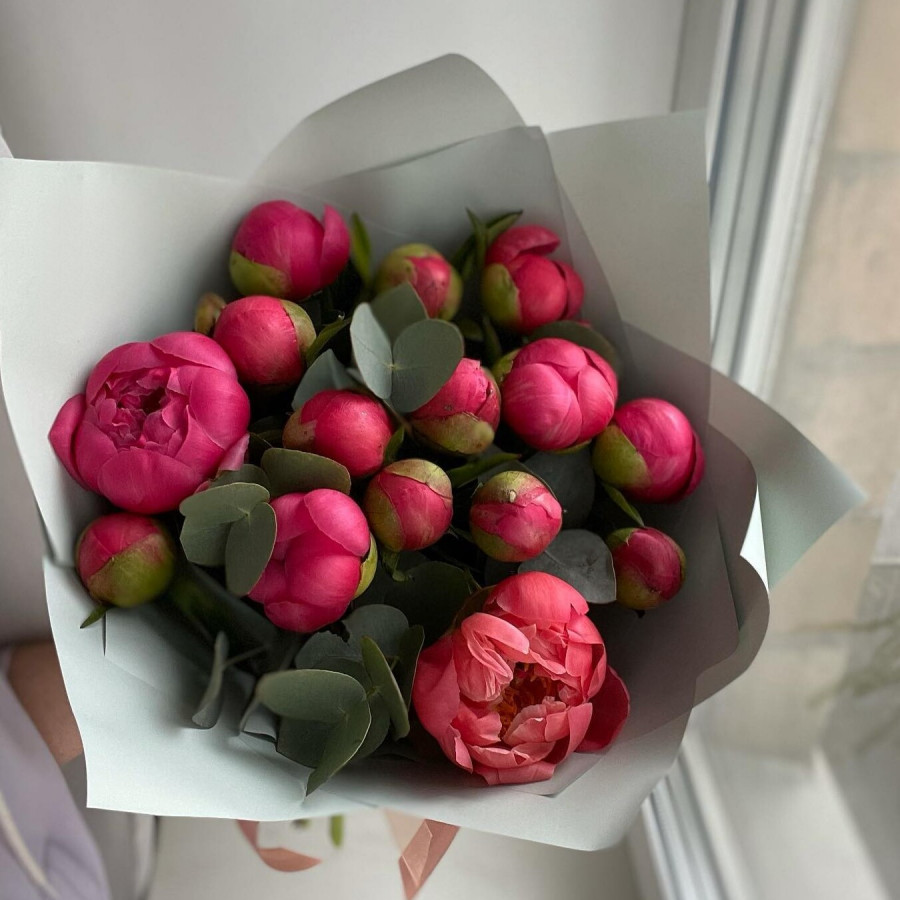 На фото коралловые пионы с эвкалиптом. В составе: пион 17 шт, эвкалипт 5 шт, крафт-бумага 1 шт, атласная лента 1 шт, . Все цветы свежие и ароматные, букет красиво оформлен и отлично подходит для подарка. Доступна доставка цветов или самовывоз.