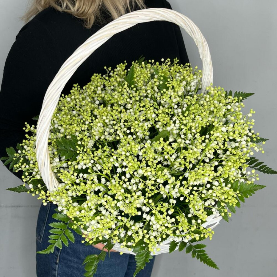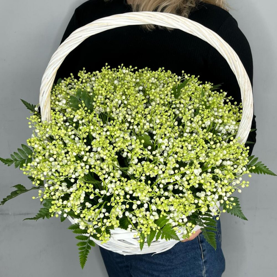 На фото корзина ландышей xl. В составе: ландыш 55 шт, оазис флористический 3 шт, корзина (xl) 1 шт, атласная лента 1 шт, . Все цветы свежие и ароматные, букет красиво оформлен и отлично подходит для подарка. Доступна доставка цветов или самовывоз.