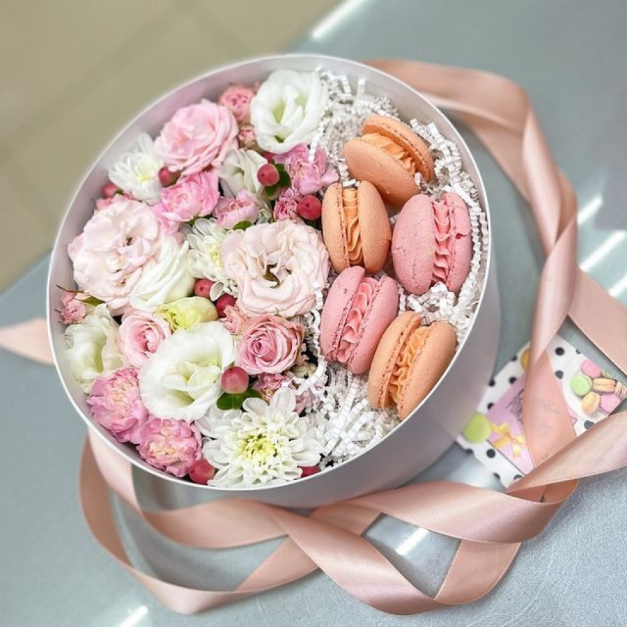На фото макаруны с эустомой в круглой коробке. В составе: макаруны 5 шт, эустома (лизиантус) 2 шт, гиперикум 2 шт, хризантема кустовая 2 шт, кустовая роза 1 шт, коробка (s) 1 шт, . Все цветы свежие и ароматные, букет красиво оформлен и отлично подходит для подарка. Доступна доставка цветов или самовывоз.