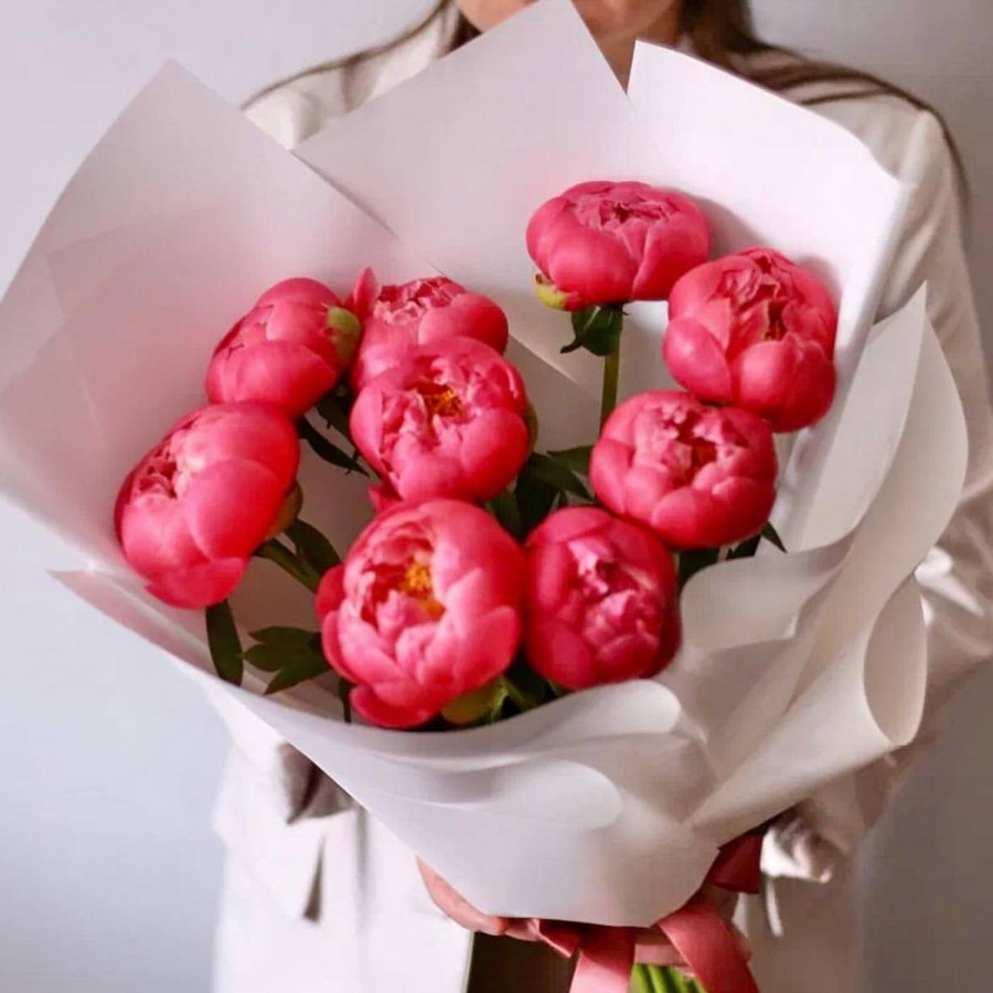 На фото монобукет из коралловых пионов. В составе: пион 9 шт, крафт-бумага 1 шт, атласная лента 1 шт, . Все цветы свежие и ароматные, букет красиво оформлен и отлично подходит для подарка. Доступна доставка цветов или самовывоз.