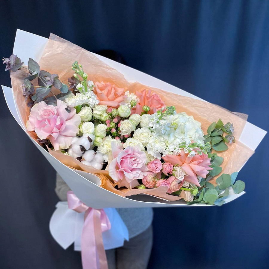 На фото огромный букет с гортензией. В составе: гортензия 1 шт, роза 4 шт, кустовая роза 9 шт, хлопок 3 шт, маттиола 4 шт, эвкалипт 3 шт, крафт-бумага 1 шт, . Все цветы свежие и ароматные, букет красиво оформлен и отлично подходит для подарка. Доступна доставка цветов или самовывоз.