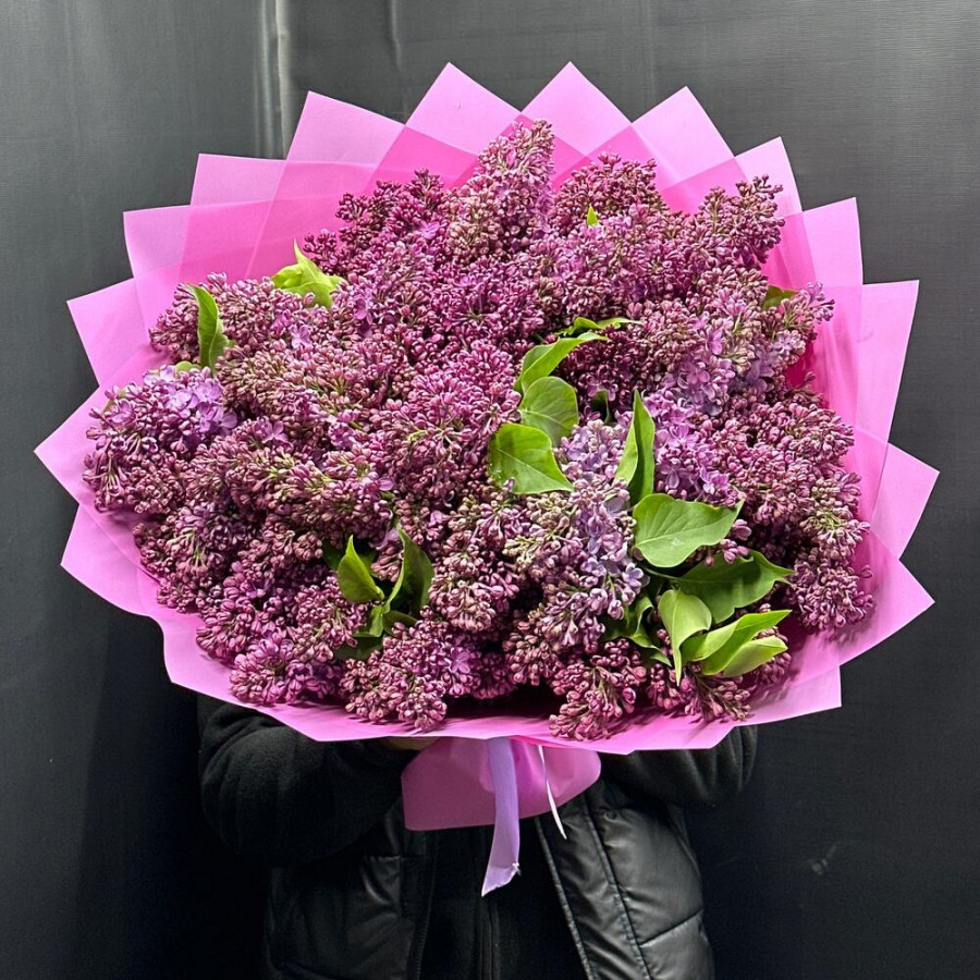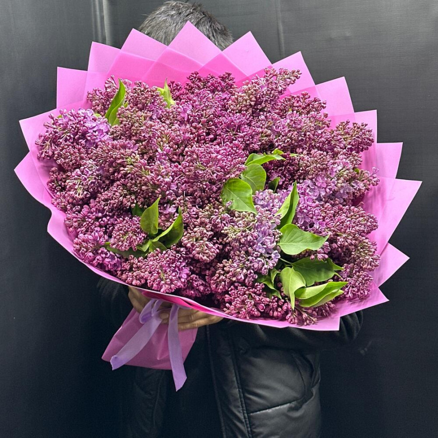 На фото огромный букет из сирени. В составе: сирень 29 шт, дизайнерская упаковка 4 шт, атласная лента 1 шт, . Все цветы свежие и ароматные, букет красиво оформлен и отлично подходит для подарка. Доступна доставка цветов или самовывоз.