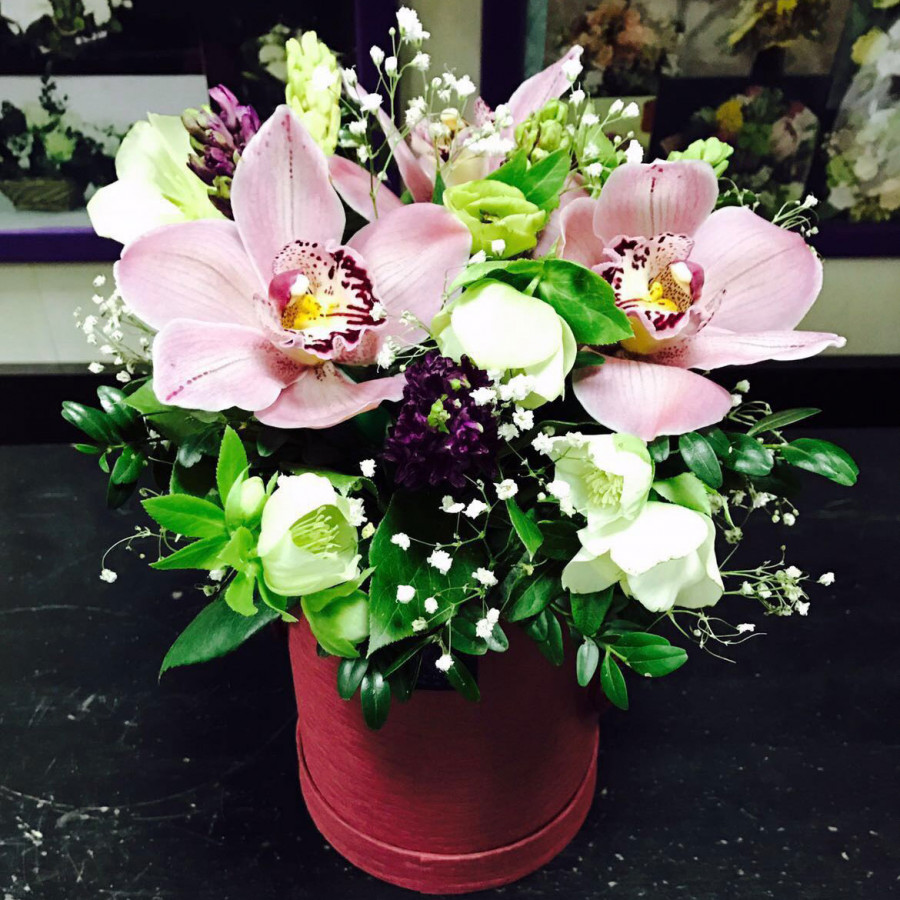 Орхидеи и альстромерии в шляпной коробке