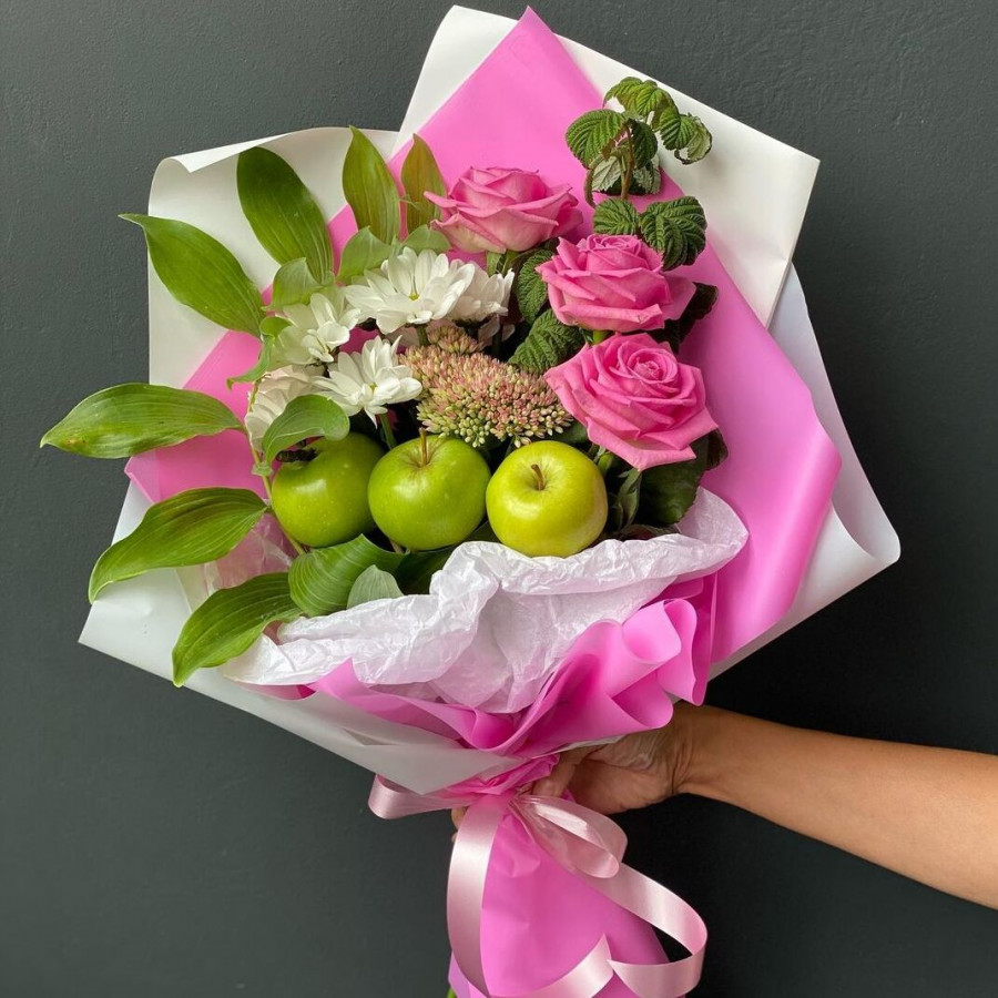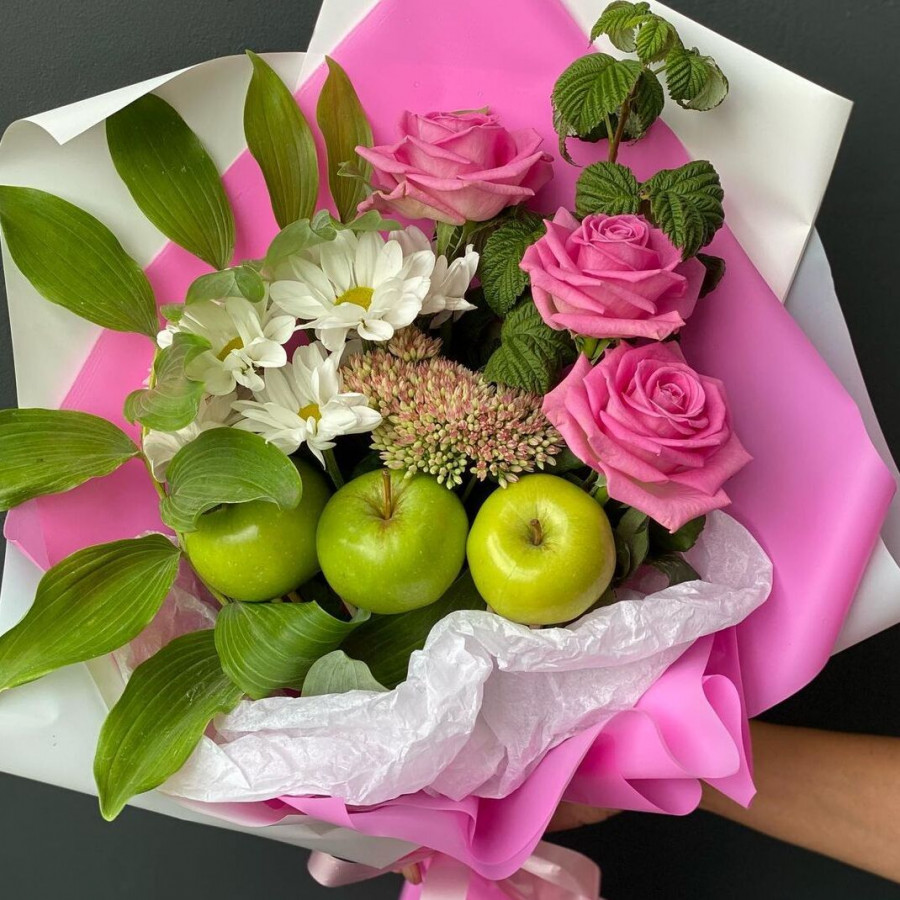 На фото розы и яблоки. В составе: роза 3 шт, яблоко 3 шт, хризантема кустовая 1 шт, мята 1 шт, аспидистра 1 шт, . Все цветы свежие и ароматные, букет красиво оформлен и отлично подходит для подарка. Доступна доставка цветов или самовывоз.