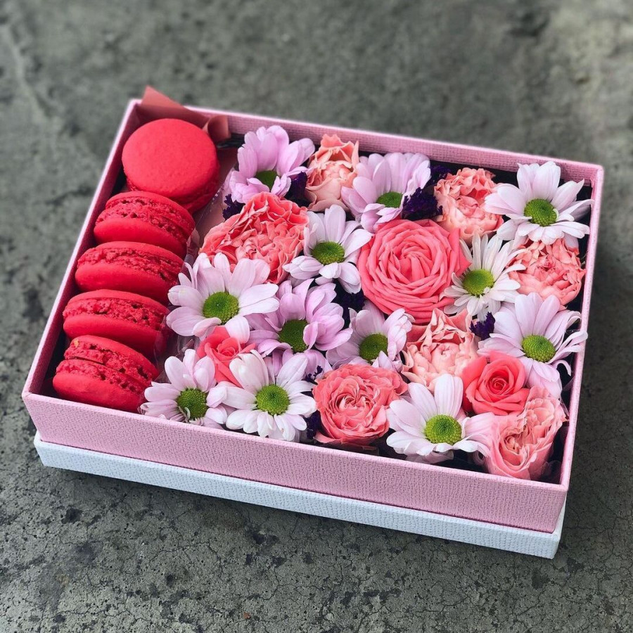Сборные цветы и макаруны в коробке