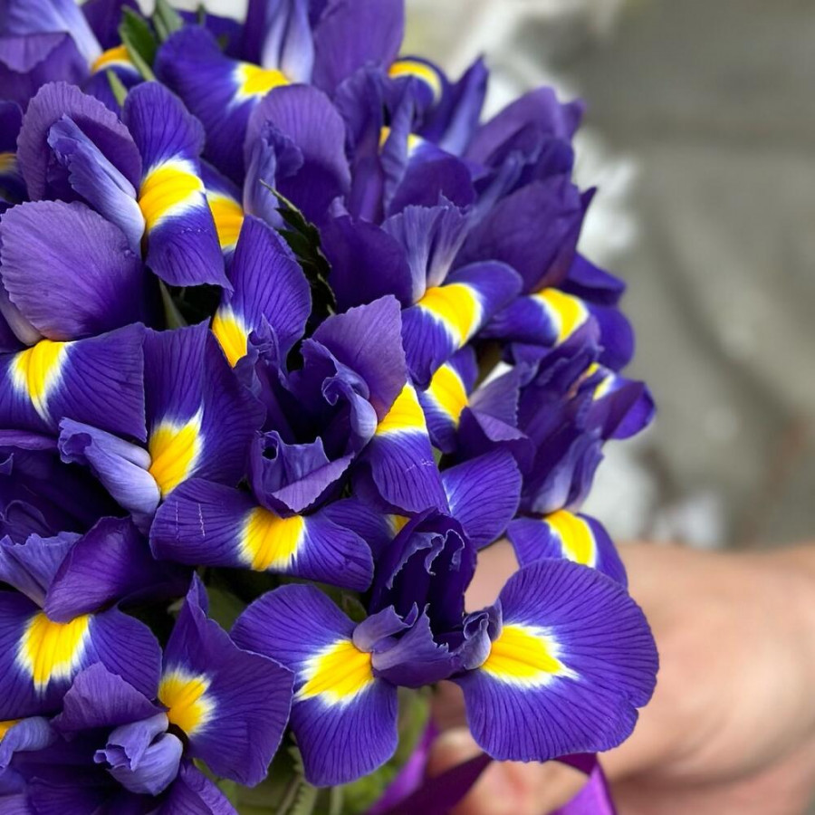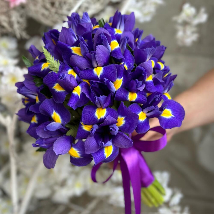 На фото свадебный букет из синих ирисов. В составе: ирис 31 шт, атласная лента 2 шт, . Все цветы свежие и ароматные, букет красиво оформлен и отлично подходит для подарка. Доступна доставка цветов или самовывоз.