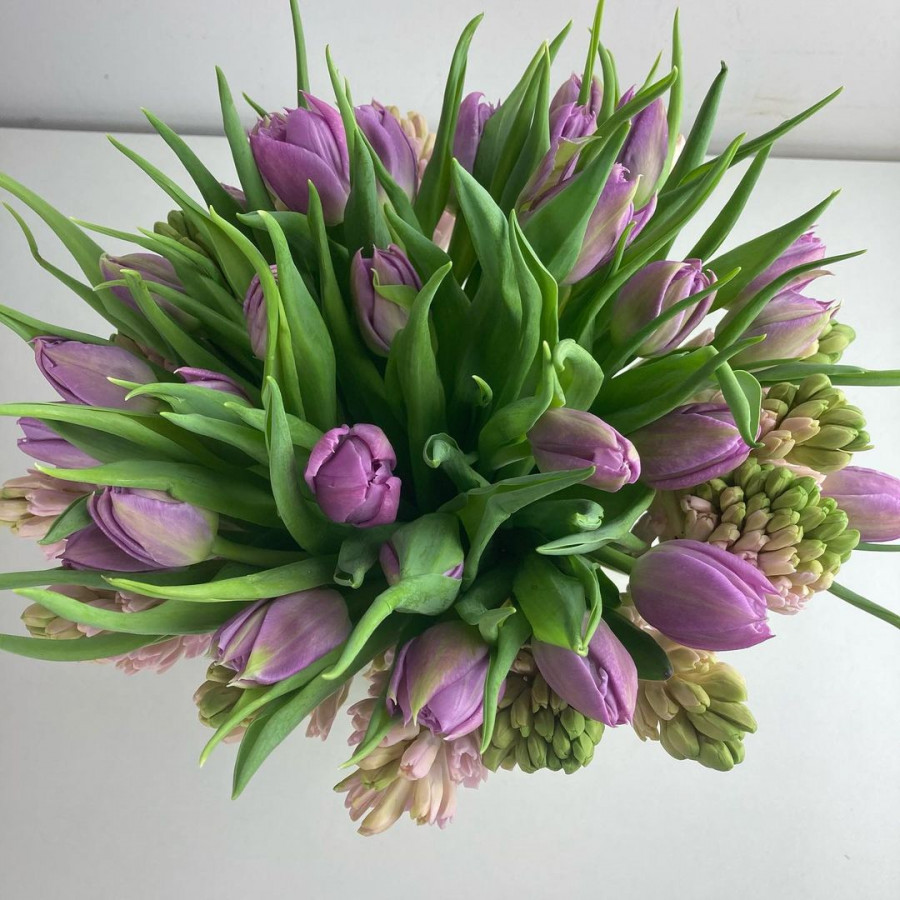 На фото тюльпаны и гиацинты в шляпной коробке. В составе: гиацинт 15 шт, тюльпан 24 шт, шляпная коробка (m) 1 шт, атласная лента 1 шт, . Все цветы свежие и ароматные, букет красиво оформлен и отлично подходит для подарка. Доступна доставка цветов или самовывоз.